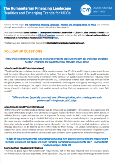 In the first webinar in this series on demystifying humanitarian financing experts from OECD, Development Initiatives, and World Vision gave presentations and answered questions regarding the current state of humanitarian financing and how recent trends are affecting NGOs.