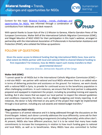 Nonetheless, the Grand Bargain aims at bringing donors closer to implementing organizations and overcoming these challenges. At the same time, emerging donors are becoming increasingly important sources of funding for humanitarian organizations. ICVA and PHAP organised the fourth session of the humanitarian financing learning stream to help participants understand this changing context for NGO access to bilateral funding.