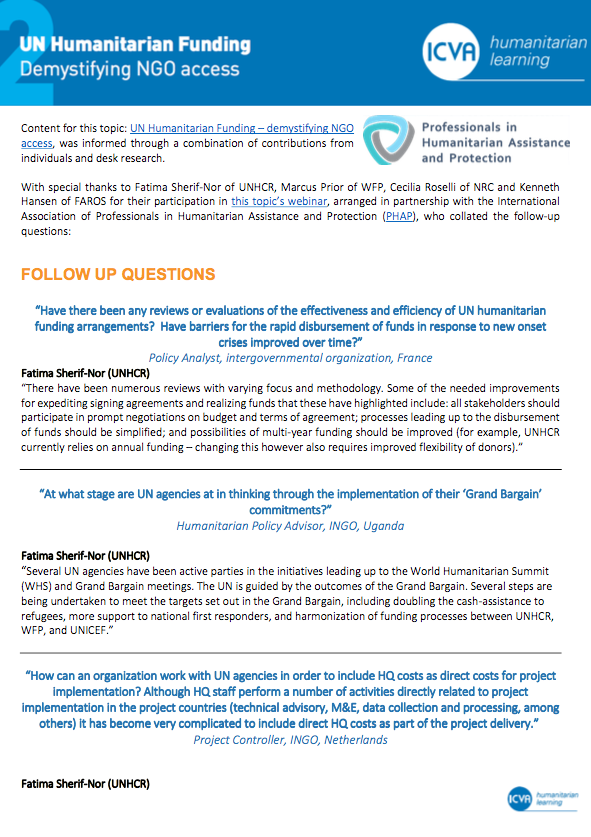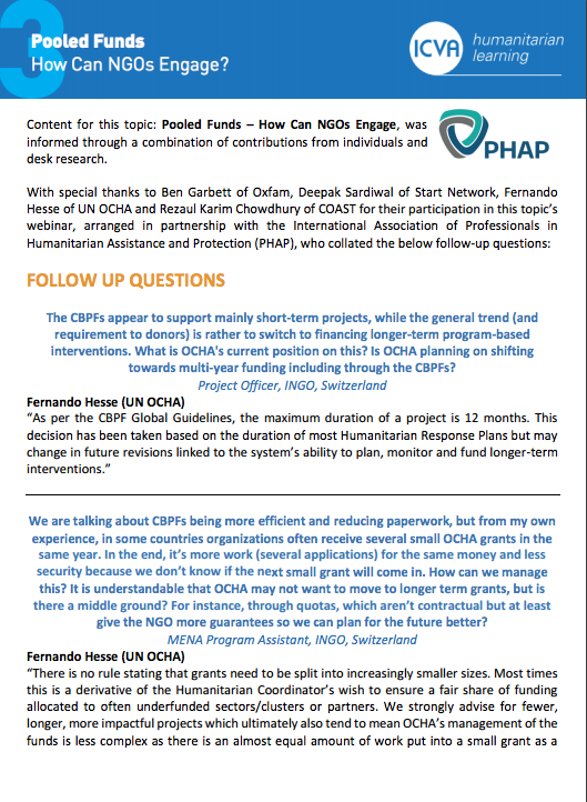 ICVA and PHAP organised the third session of the humanitarian funding learning stream. The session provided participants with an overview of the different existing pooled funding mechanisms accessible directly to NGOs, including CBPFs, the START fund and the NEAR network’s pooled fund mechanism. Presenters addressed current challenges and opportunities regarding NGO access to pooled funds followed by an opportunity for questions and answers.