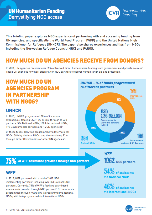UN agencies often partner with international and local NGOs to implement humanitarian assistance and protection. NGOs, on their part, are faced with the challenge of understanding and dealing with different, and often complex, UN partnership frameworks. Understanding how these frameworks function and how humanitarian funding through the UN is evolving.
