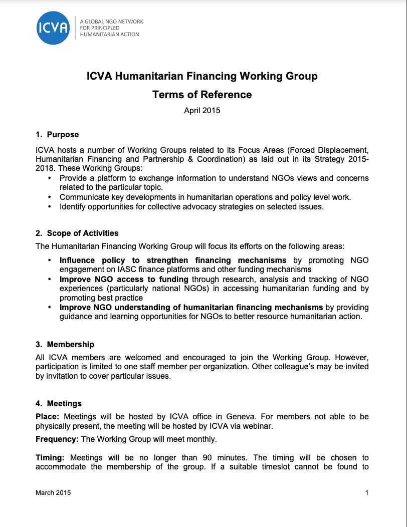 ICVA hosts a number of working groups related to its focus areas (forced migration, financing and coordination) as laid out in ICVA’s Strategy. This is the proposed terms for reference for the ICVA humanitarian financing working group.