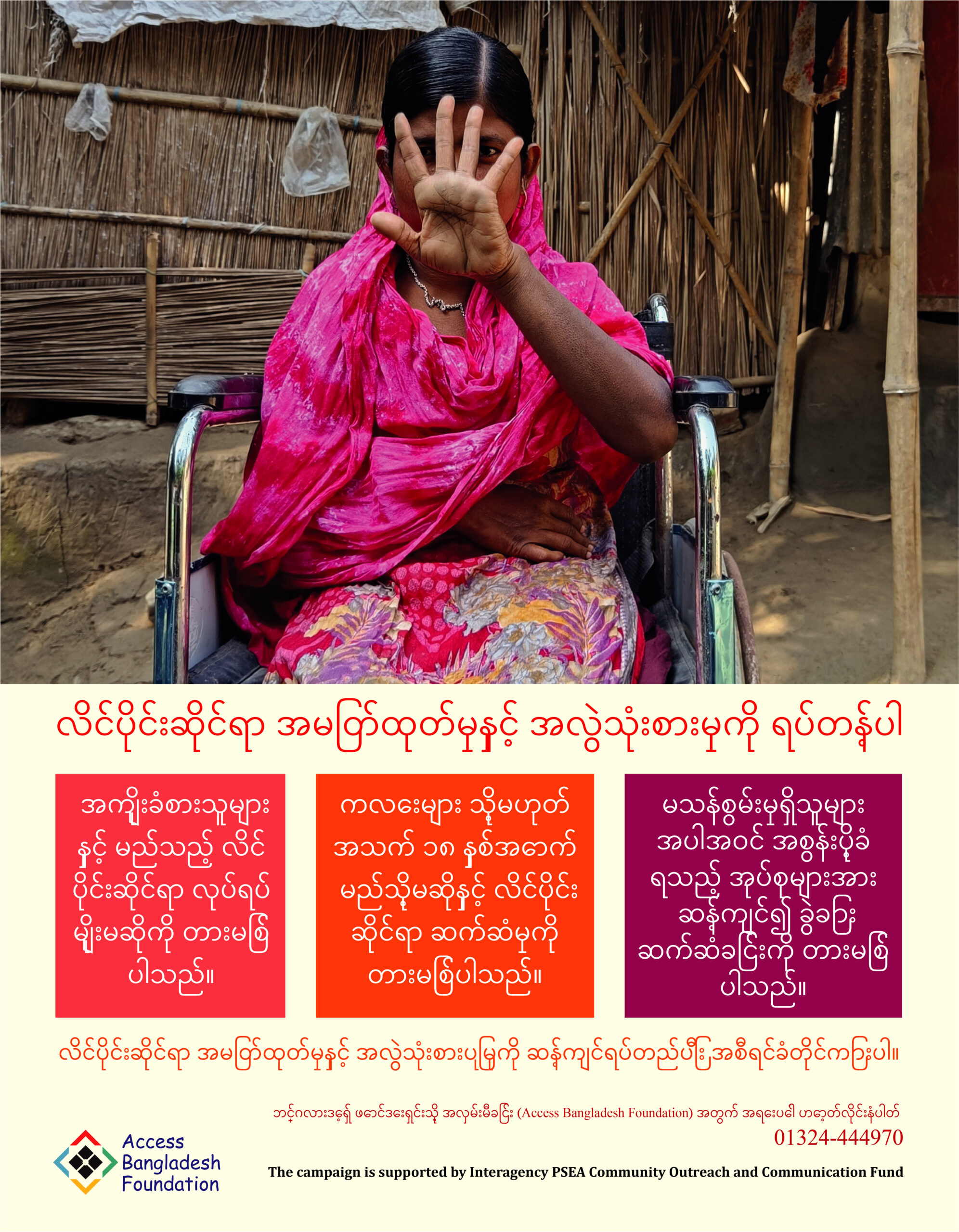 - Printed material including posters, leaflets, stickers, pens and T-shirts in in both Bengali and Burmese languages