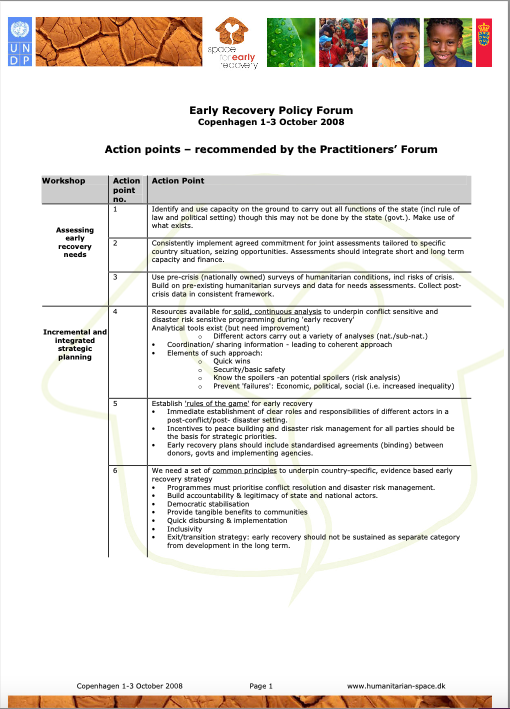 Action Points as recommended by the Practitioners’ Forum for the Early Recovery Policy Forum in Copenhagen (1-3 October 2008).