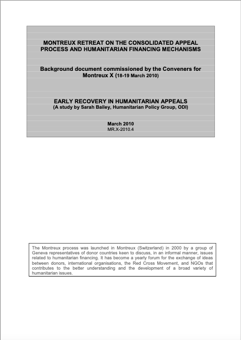 Two background documents from the 2010 Montreux Retreat on the Consolidated Appeal Process and Humanitarian Financing Mechanisms. The document “Early Recovery in Humanitarian Appeals” analyses how early recovery activities are financed through humanitarian appeals, focusing primarily on Consolidated Appeals (CAPs), so that donors and aid agencies can better understand what is being financed and why. The document “CAPs over the Years – A Brief Retrospective on Ten Years of Montreux Retreats” reviews how the joint planning and financing encompassed by the CAP have evolved, and how the humanitarian system has been able to respond to donors’ needs.