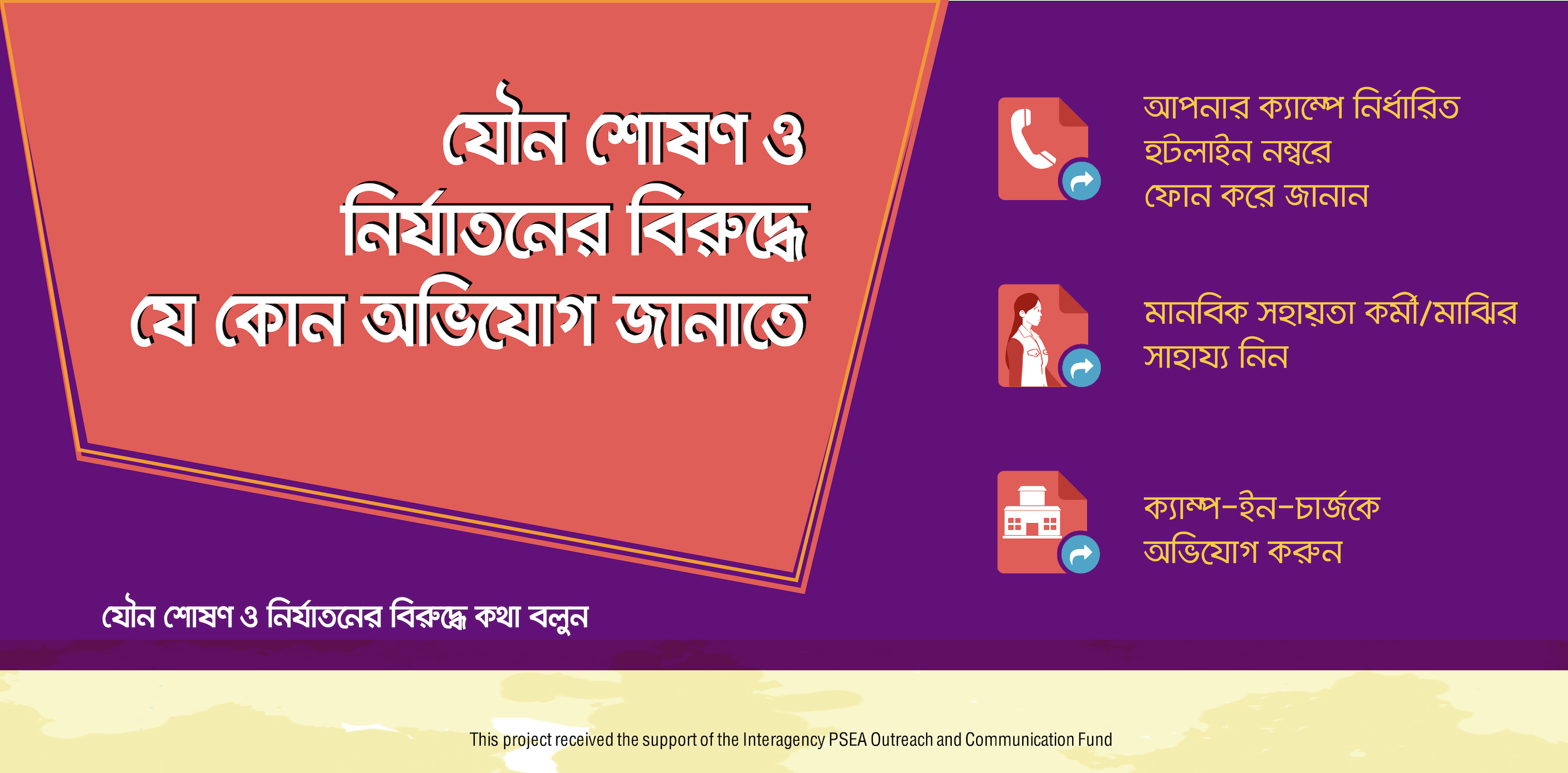 - a leaflet in English, Burmese and Bangla to raise awareness on PSEA and on how to report, targeting affected communities and refugees.