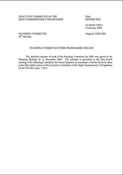 Calendar of Work – UNHCR Standing Committee 44th Meeting Work Programme for 2009