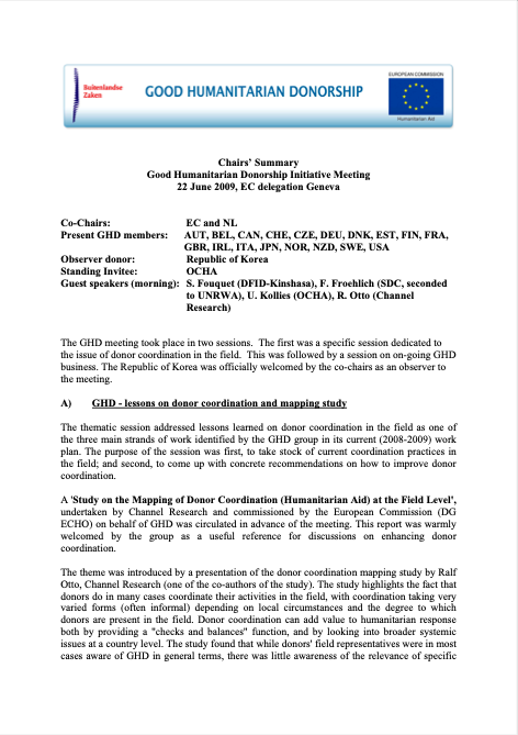 The chairs’ summary from the Good Humanitarian Donorship Initiative Meeting on 22 June 2009, hosted by the European Commission.