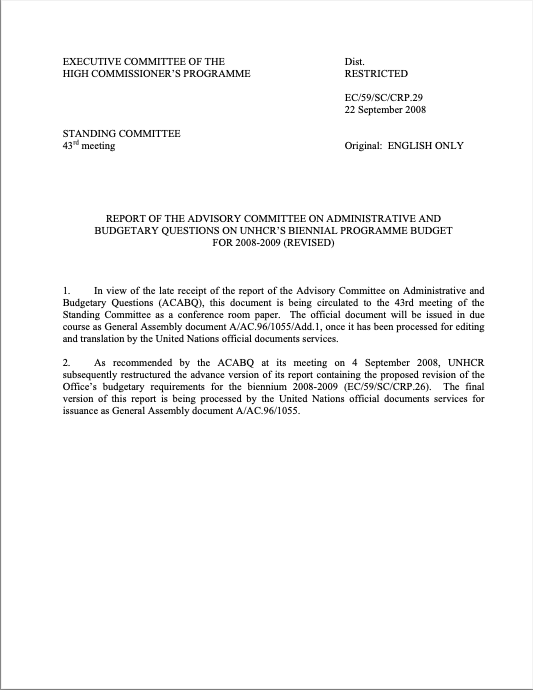 Conference Room Paper – UNHCR Standing Committee 43rd Meeting Report of the Advisory Committee on Administrative and Budgetary Questions on UNHCR’s Biennial Programme Budget for 2008-2009 (Revised)