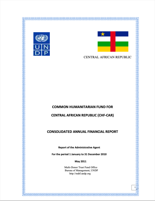 This consolidated annual financial report on the Central African Republic Common Humanitarian Fund was prepared by the United Nations Development Programme Multi‐Donor Trust Fund Office. This report covers the period 1 January to 31 December 2010 and provides financial data on progress made in the implementation of projects funded by the Central African Republic Common Humanitarian Fund.