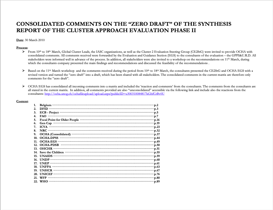A matrix of consolidated comments from Global Cluster Leads, the IASC organizations, and the Cluster 2 Evaluation Steering Group regarding the “Zero Draft” of the Synthesis Report of the Cluster Approach Evaluation Phase II. These comments were consolidated by the OCHA Evaluation and Guidance Section into a matrix, and include the “reaction and comments” from the consultants of the evaluation.