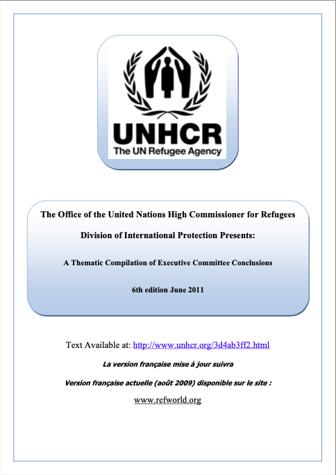 The Office of the UN High Commissioner for Refugees Division of International Protection provides the cover page for “A Thematic Compilation of Executive Committee Conclusions.” This compilation is the 6th edition.