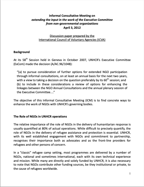Discussion Paper – ICVA Informal Consultative Meeting on Extending the Input in the Work of the Executive Committee from Non-Governmental Organizations