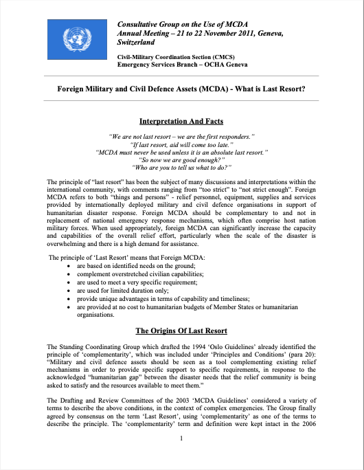 The OCHA Civil-Military Coordination Section (CMCS) Emergency Services Branch provides information regarding the principle of “last resort” at the 2011 annual meeting of the Consultative Group on the Use of Military and Civil Defence Assets (MCDA). This document includes information about the origin of the principle, as well as specifics regarding implementation.