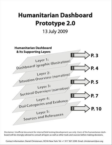 OCHA provides a prototype for reporting results on field testing via the Humanitarian Dashboard and its supporting layers. These layers include the dashboard as a graphic illustration, a situation overview, a sectoral overview, dial categories and evidence, and sources and references.