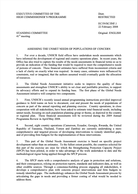 A document from the UNHCR Standing Committee’s 41st Meeting regarding the Global Needs Assessment initiative. This initiative seeks to improve the quality of these assessments and strengthen UNHCR’s ability to set clear and justifiable priorities, to support its advocacy efforts, and to expand its funding base.