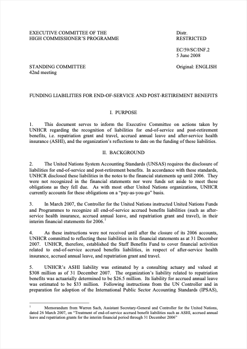 This document serves to inform the Executive Committee on actions taken by UNHCR regarding the recognition of liabilities for end-of-service and post-retirement benefits, i.e. repatriation grant and travel, accrued annual leave and after-service health insurance (ASHI), and the organization’s reflections to date on the funding of these liabilities.