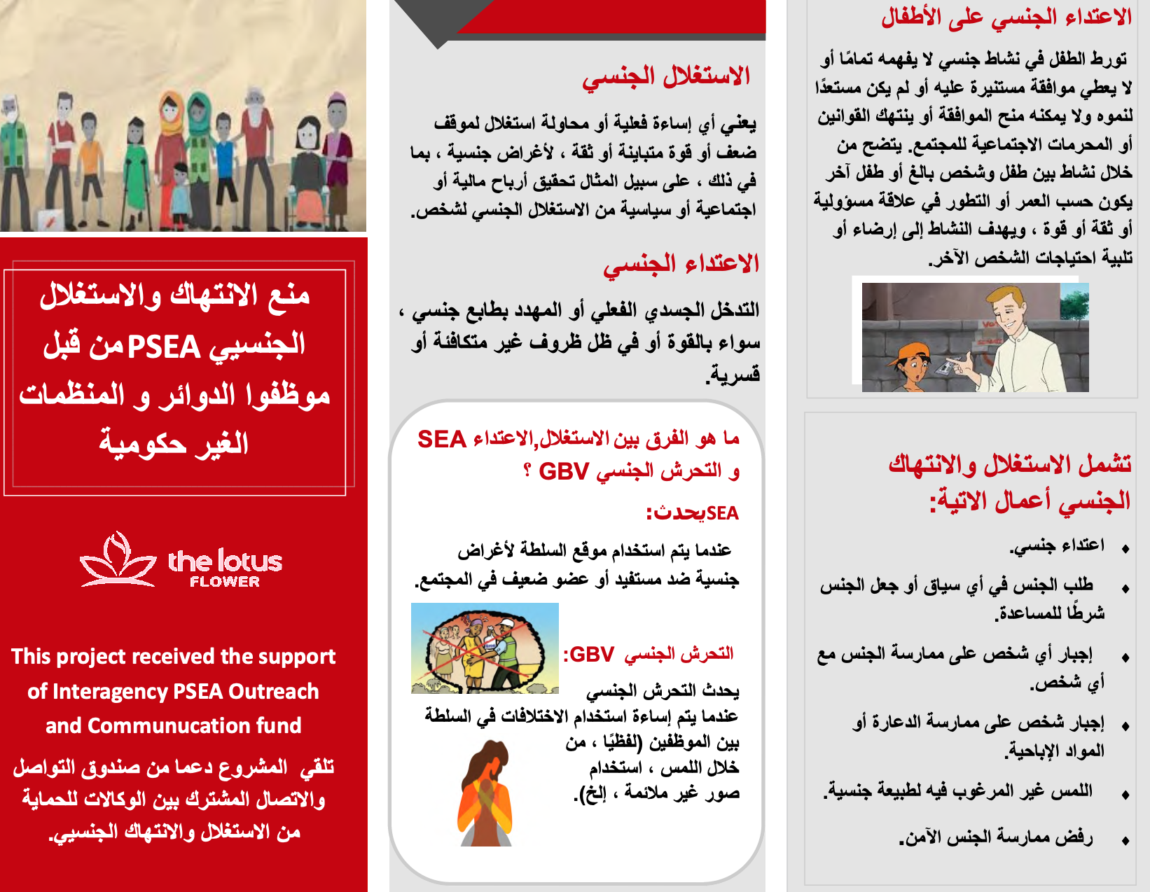 - a leaflet in Arabic to raise awareness on PSEA and on how to report, targeting IDPs and refugees.