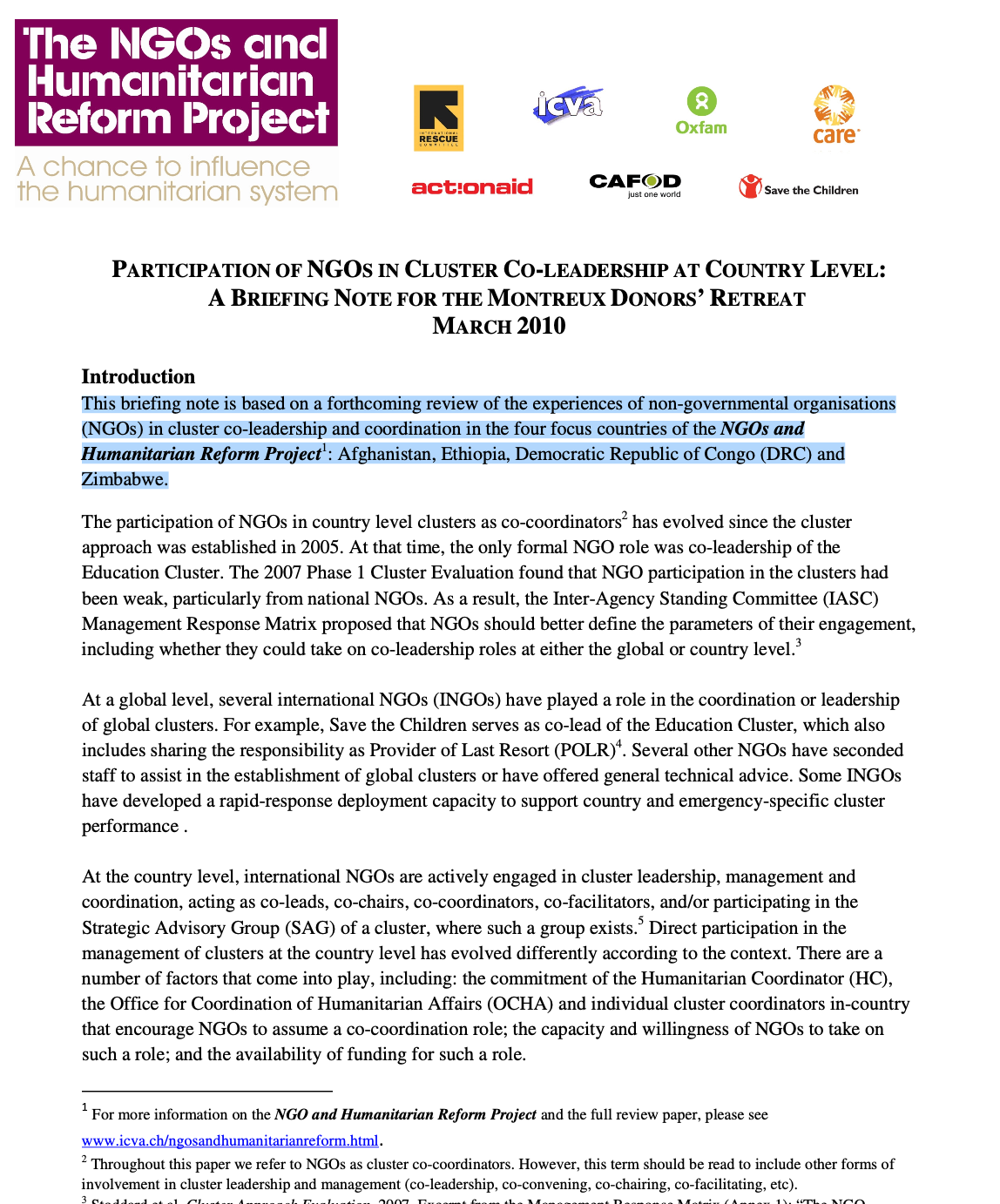 This briefing note is based on a forthcoming review of the experiences of non-governmental organisations (NGOs) in cluster co-leadership and coordination in the four focus countries of the NGOs and Humanitarian Reform Project1: Afghanistan, Ethiopia, Democratic Republic of Congo (DRC) and Zimbabwe.